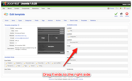 เทมเพลตที่สร้างขึ้นมาใหม่นี้ ระบบจะทำการสร้างโครงสร้างไว้ให้ สำหรับท่านที่มีความเชี่ยวชาญเรื่อง CSS และเขียนโค้ดได้ สามารถเปิดไฟล์เพื่อทำการแก้ไขได้ โดยโครงสร้างไฟล์จะอยู่ที่ components\com_flexicontent\templates\ชื่อเทมเพลตที่คุณตั้งชื่อไว้ โดยในเทมเพลตนั้นจะเป็น Layout ส่วนการกำหนดว่ามีฟิลด์อะไรบ้างนั้น จะอยู่ที่การกำหนดผ่าน UI ส่วนของ Edit Template ในเว็บ (ภาพด้านถัดไป)